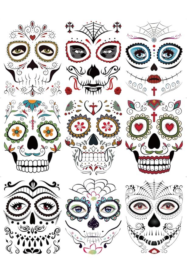 Amazon Com Day Of The Dead Sugar Skull Tattoos 100counts Konsait Halloween Temporary Face Tattoos Sugar Skull Puppy Black Skeleton Web Red Roses Tattoo For Kids Boys Girls Mexican Halloween Party Favor Supplies